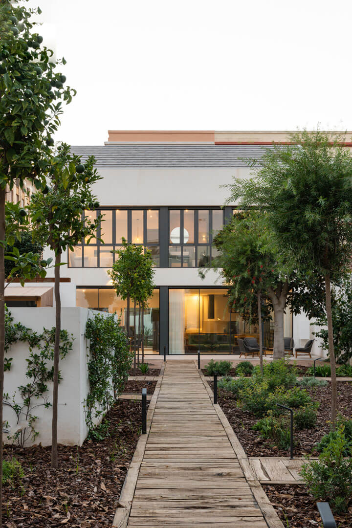 La casa de invitados es más pequeña, en la parte trasera, y tiene acceso desde la calle de atrás. Abrimos grandes ventanales a la luz y las vistas, pero protegiéndolos con la forma de los muros que los rodean, dando a la casa su aspecto final.